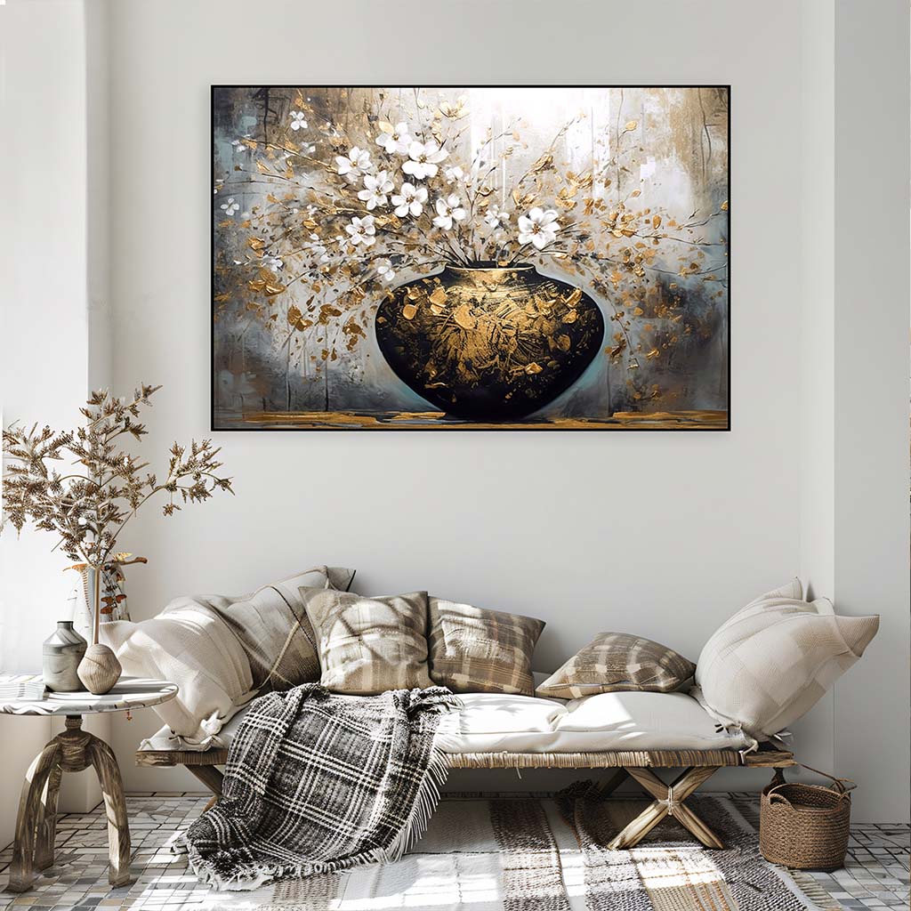 Het schilderij Blooming gold is een uniek kunstwerk uit onze collectie bloemen schilderij. Breng luxe en elegantie in je interieur met dit moderne bloemen schilderij, een schitterend kunstwerk dat bloesem in volle bloei toont in een rijk versierde vaas. De combinatie van goud- en wittinten geeft het een chique uitstraling, perfect voor wie houdt van een schilderij met bloemen dat opvalt. Dit schilderij bloemen met abstracte accenten, verenigt klassieke bloemmotieven met een hedendaagse twist, waardoor het ideaal is voor zowel moderne als klassieke interieurs. De horizontale compositie maakt dit een prachtig bloemen schilderij horizontaal, geschikt voor boven een bank, bed of eettafel. Door de indrukwekkende afmeting is dit ook een bloemen schilderij groot, dat meteen de aandacht trekt in elke ruimte. Het is geïnspireerd op een stilleven bloemen met een moderne interpretatie, waardoor het valt onder de categorie moderne bloemen schilderijen. Met dit kunstwerk haal je een uniek en sfeervol schilderij bloemen in vaas in huis dat blijft verrassen.