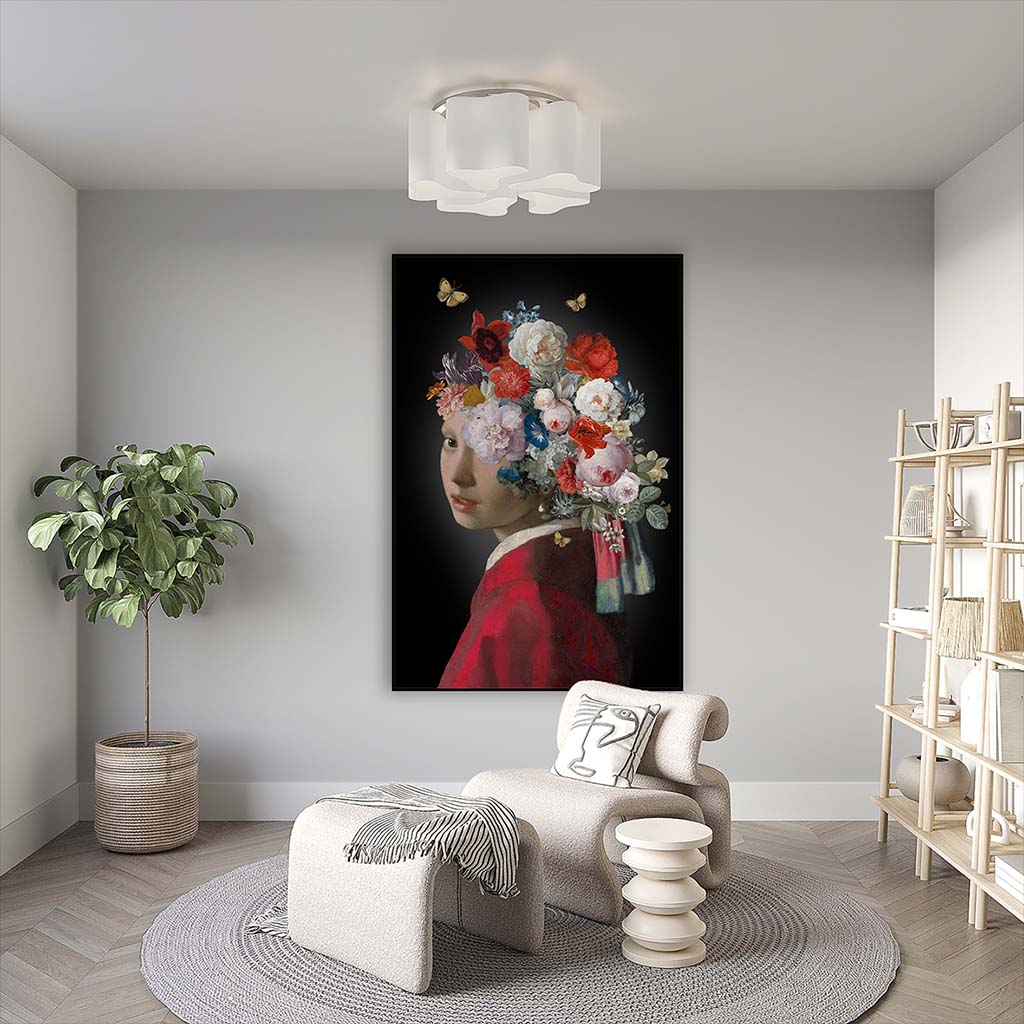 De toevoeging van bloemen maakt dit werk een waar kunststatement: een ode aan de natuur en tegelijk een hommage aan de oude meesters bloemen. Vaak aangeduid als Meisje met de Parel bloemen, brengt dit schilderij een frisse en eigentijdse uitstraling in huis. Het kunstwerk is een tijdloze eyecatcher die zowel de charme van de 17e eeuw als de dynamiek van nu weet te vangen.