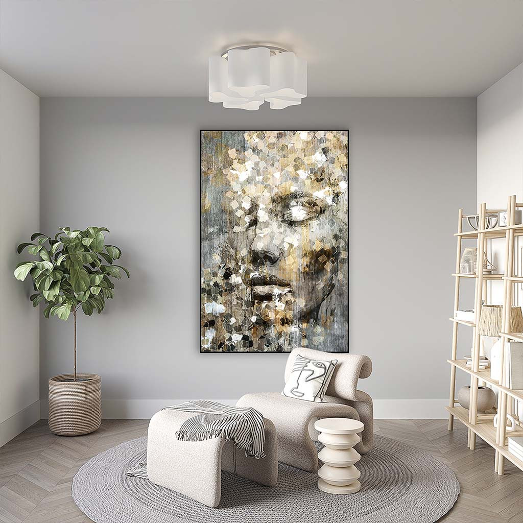 Breng een mystieke en moderne sfeer in je interieur met dit fascinerende schilderij van een vrouwengezicht. Dit kunstwerk combineert abstractie en vrouwelijke elegantie met een subtiele touch van goudtinten, wat een verfijnde en stijlvolle uitstraling geeft. Als verticaal schilderij, voegt dit werk diepte en karakter toe aan elke ruimte. Het schilderij is ideaal voor liefhebbers van modern design en abstracte kunst en komt prachtig tot zijn recht in dit moderne ArtFrame. Of je nu zoekt naar een “schilderij vrouw met goud” of een “abstract schilderij vrouw”, deze wanddecoratie geeft een verfijnde en eigentijdse look aan elke kamer. Perfect voor wie op zoek is naar een kunstwerk met een luxe afwerking.