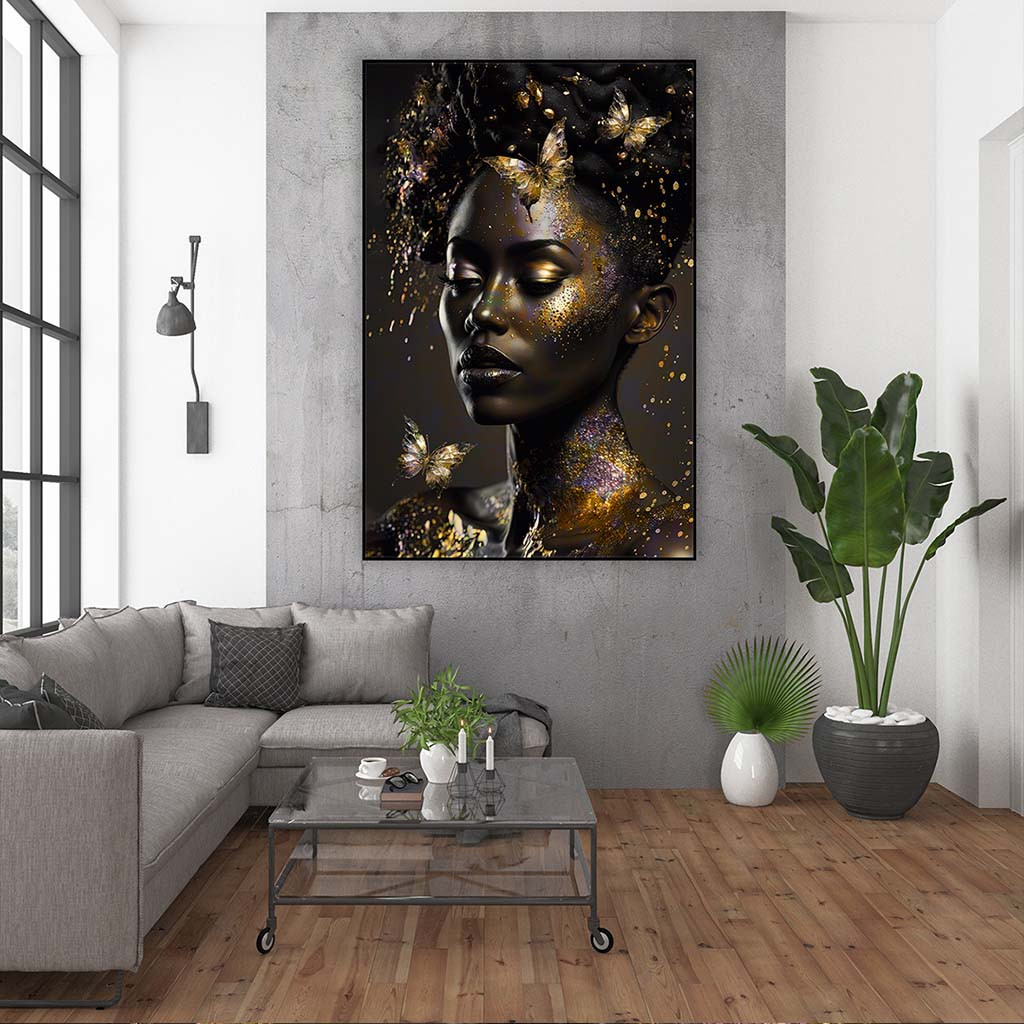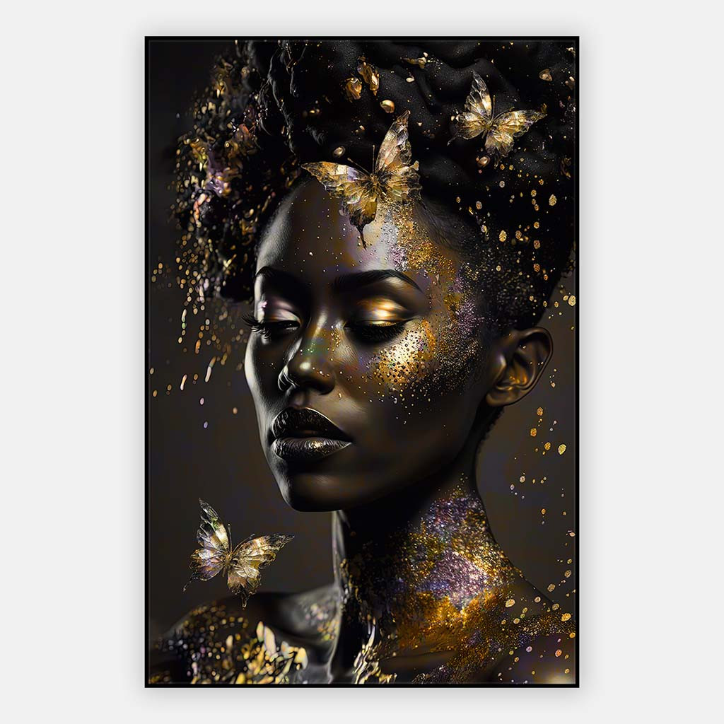 Een prachtig schilderij van een vrouwengezicht omringd door gouden vlinders. Het moderne kunstwerk, Veil of Light, combineert vrouwelijke elegantie in gouden en zwarte tinten. Ideaal als wanddecoratie past dit “schilderij vrouw gezicht modern” perfect in hedendaagse interieurs. Zoek je naar een “vrouw met vlinders schilderij”? Dit kunstwerk biedt precies dat, met een unieke en tijdloze uitstraling.