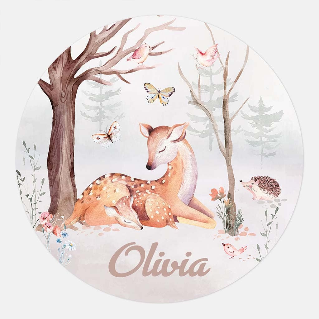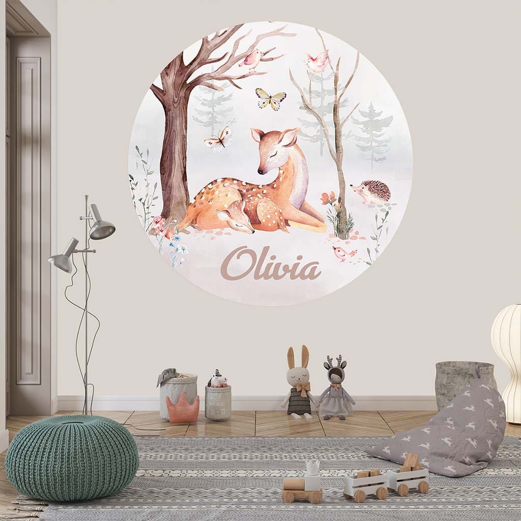 Geef de baby- of kinderkamer een unieke uitstraling met deze prachtige gepersonaliseerde behangcirkel! Met een schattig ontwerp van bosdieren zoals herten, vogels en een egel, straalt deze muurdecoratie een rustgevende en natuurlijke sfeer uit. Personaliseer de behangcirkel met de naam van je kind, zoals Olivia op het voorbeeld, voor een speciaal en persoonlijk tintje. Perfect voor een natuurlijke inrichting, ideaal voor elke babykamer of kinderkamer. Deze ronde muursticker is een eyecatcher die jarenlang mooi blijft. Leuk om cadeau te doen als geboortecirkel. De behangcirkel kan besteld worden op Gekkotex en Roughmark.
