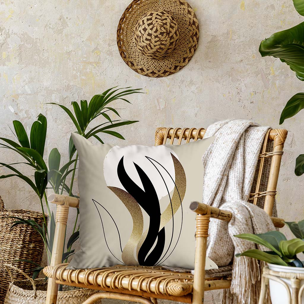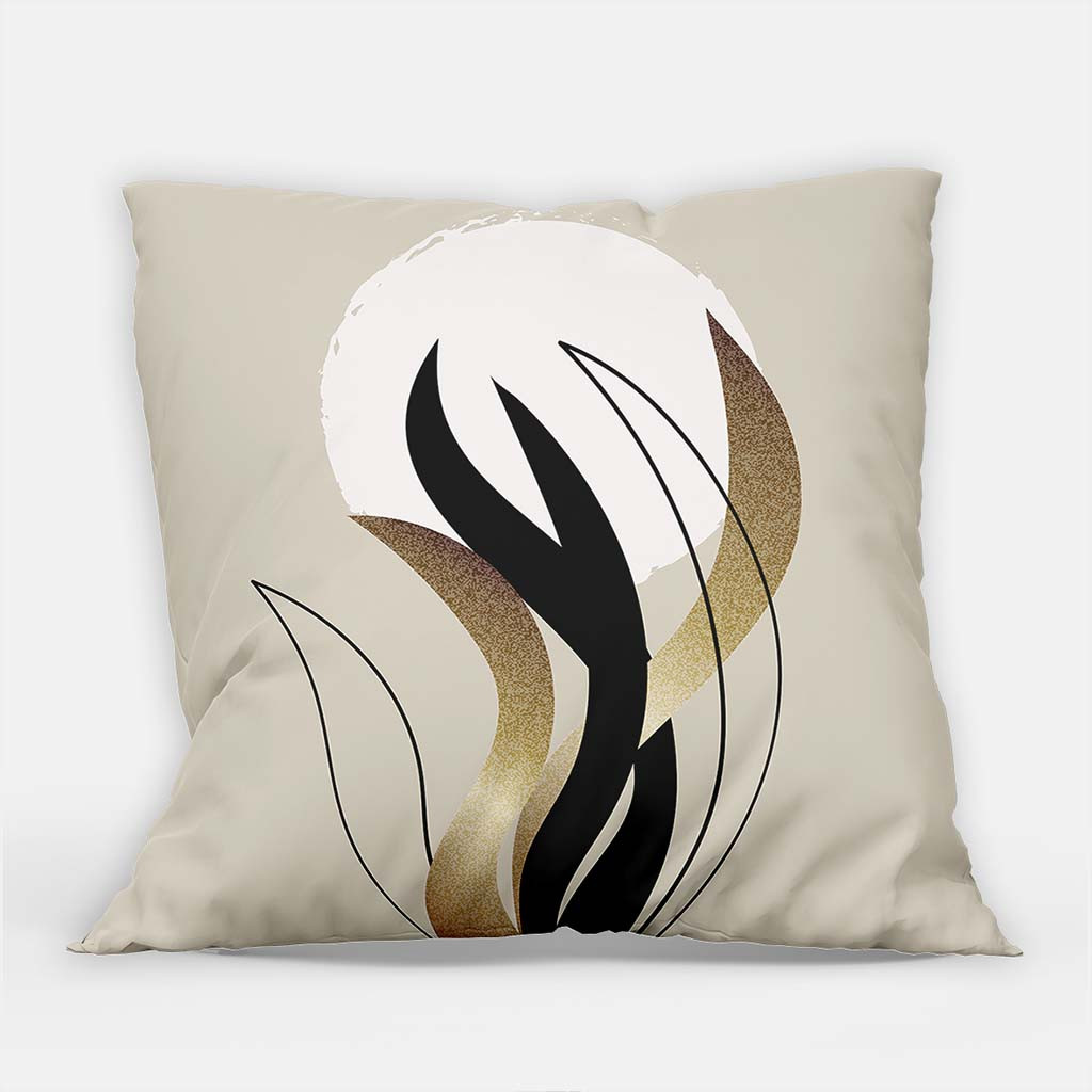 Prachtig sierkussen met mooie abstracte kunst met botanische vormen, bladeren. Mooie rustige kleuren, maar zeker niet saai. In de print zitten gouden elementen verwerkt. Leuke eyecatchers met een vleugje luxe passend in elke loungehoek.