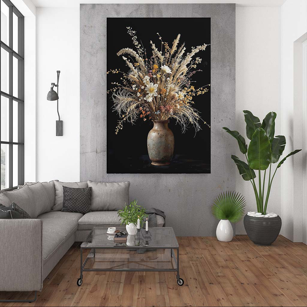 Het bloemen schilderij met droogbloemen in een oude vaas is onderdeel van de collectie bloemen schilderijen op canvas. Haal de warme en landelijke sfeer in huis met dit unieke canvas schilderij bloemen in vaas. Het kunstwerk toont een prachtig boeket van droogbloemen in natuurlijke tinten, stijlvol gerangschikt in een antieke vaas die een rustieke uitstraling heeft. Dit schilderij met bloemen op canvas combineert klassieke elegantie met een moderne touch, waardoor het perfect past in zowel landelijke als hedendaagse interieurs. Als je op zoek bent naar een canvas schilderij met bloemen dat verfijning en warmte toevoegt aan je ruimte, is dit canvas bloemen schilderij de ideale keuze. Een tijdloze decoratie die subtiele natuuraccenten toevoegt aan je interieur. Met dit prachtige werk breng je creativiteit en individualiteit in je ruimte, perfect voor wie op zoek is naar een bijzondere en originele decoratie.