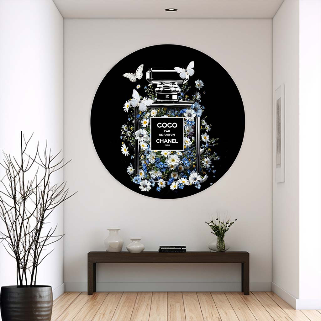 De muurcirkel CoCo Chanel Bloom is onderdeel van de collectie muurcirkel Bloemen. Dit unieke CoCo Chanel schilderij als wandcirkel is een perfecte mix van mode en natuur, met een betoverende compositie van delicate chanel bloemen rondom het klassieke parfumflesje. Dit coco schilderij straalt klasse uit en is een echte blikvanger in je interieur. Of je nu een modern of klassiek interieur hebt, dit chanel bloemschilderij past perfect als stijlvolle wanddecoratie.