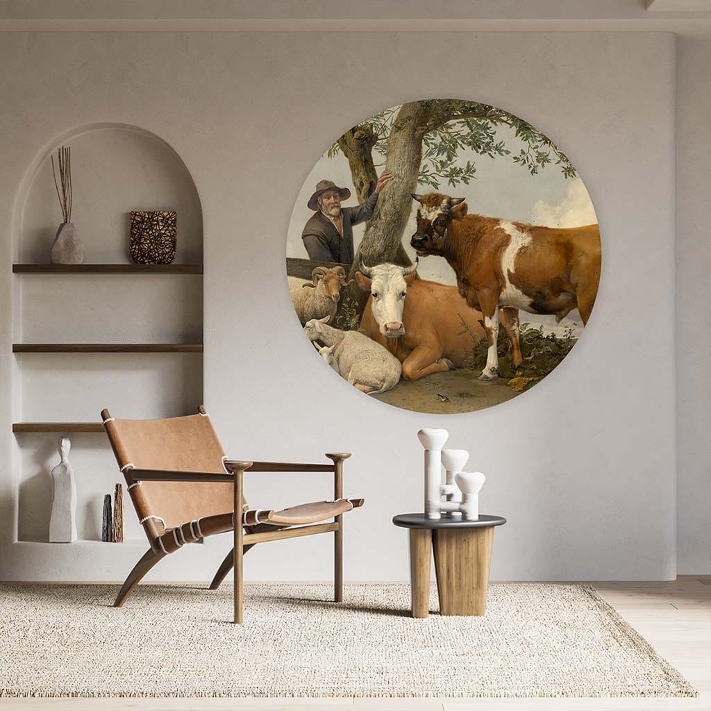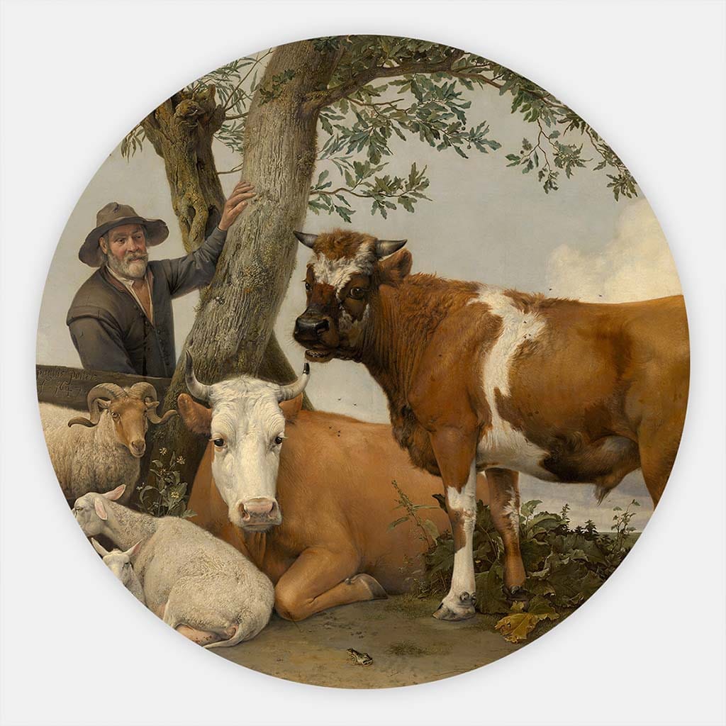 Wandcirkel met het beroemde schilderij De Stier, geschilderd door Paulus Potter. Het originele schilderij is een enorm schilderij van bijna vier meter breed. Het is uniek omdat de stier niet alleen als bijfiguur in een landschap verschijnt, maar de absolute hoofdrol speelt. Paulus Potter staat bekend om zijn realistische weergave van dieren, en “De Stier” is een meesterlijk voorbeeld van zijn talent. De muurcirkel is te verkrijgbaar op verschillende materialen: Dibond, Forex, Aluminium en Hout (Multiplex) en in verschillende formaten: Ø 40 cm, Ø 50 cm, Ø 60 cm, Ø 70 cm, Ø 80 cm, Ø 90 cm, Ø 100 cm, Ø 120 cm en Ø 140 cm. Zo is er altijd wel een plek in huis waar de wandcirkel past. Je kiest zelf op welk materiaal je de wandcirkel wilt bestellen. Onderaan de pagina vind je alle informatie over onze materialen.