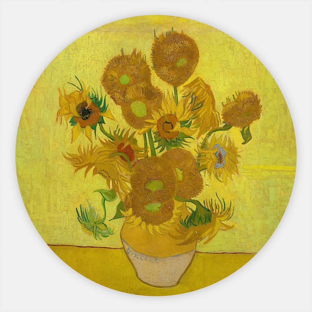 Kleurige wandcirkel met het beroemde schilderij De Zonnebloemen van Vincent van Gogh. Van Gogh schilderde meerdere versies van de zonnebloemen. Dit bloemenschilderij is een van Van Goghs bekendste werken. Zijn liefde voor felle kleuren en dikke penseelstreken komt hier prachtig naar voren. De muurcirkel is te verkrijgbaar op verschillende materialen: Dibond, Forex, Aluminium en Hout (Multiplex) en in verschillende formaten: Ø 40 cm, Ø 50 cm, Ø 60 cm, Ø 70 cm, Ø 80 cm, Ø 90 cm, Ø 100 cm, Ø 120 cm en Ø 140 cm. Zo is er altijd wel een plek in huis waar de wandcirkel past. Je kiest zelf op welk materiaal je de wandcirkel wilt bestellen. Onderaan de pagina vind je alle informatie over onze materialen.