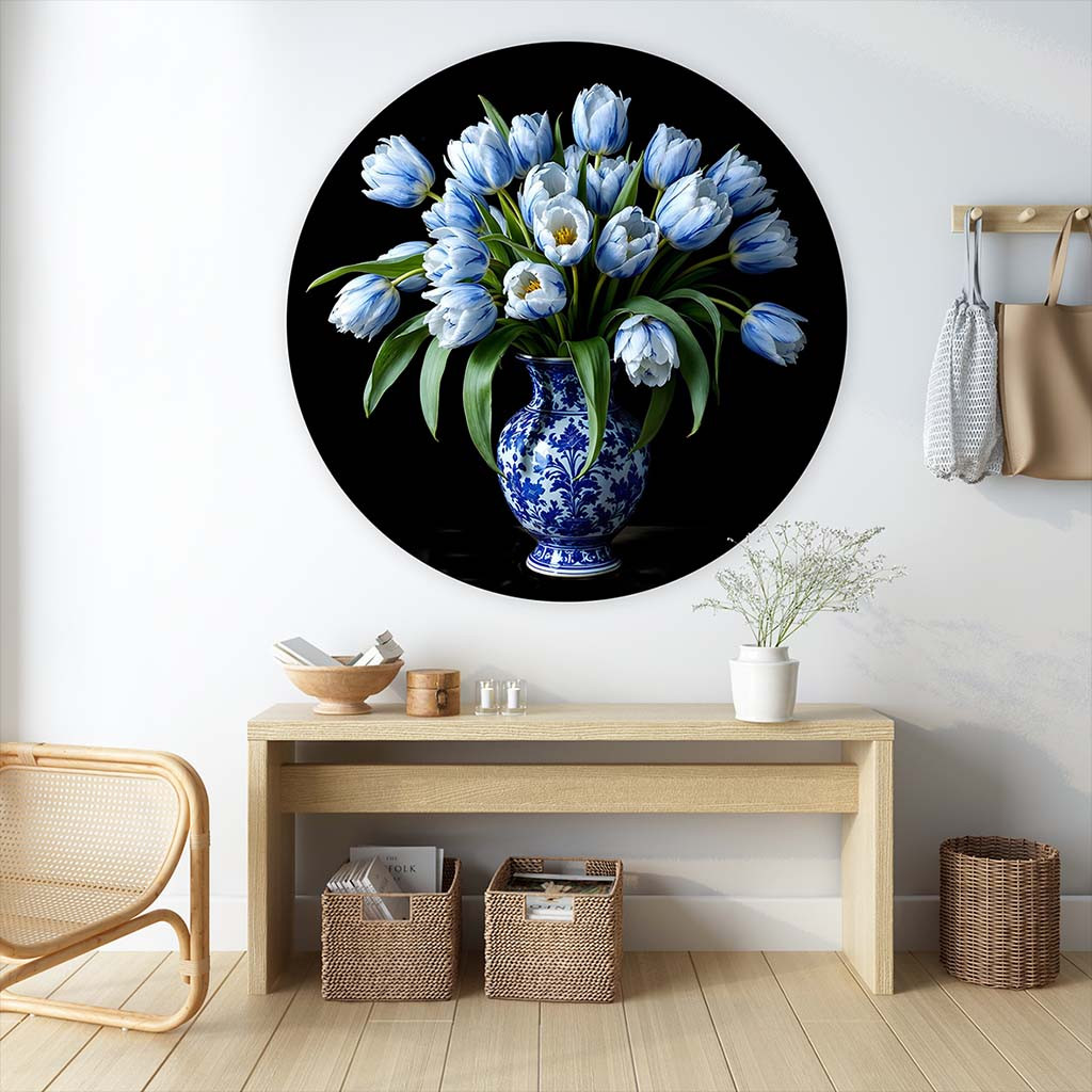 Breng de tijdloze schoonheid van tulpen bloemen en Delfts blauw in huis met deze prachtige muurcirkel. Het schilderij toont een verfijnd boeket van blauw-witte tulpen, stijlvol geschikt in een klassieke Delfts blauwe vaas. Dit ronde schilderij straalt rust en elegantie uit en is perfect als blikvanger in elke ruimte. Ideaal voor liefhebbers van wandcirkels, bloemen schilderijen, en moderne muurdecoratie. De muurcirkel is verkrijgbaar in diverse maten en past zowel in klassieke als moderne interieurs. Voeg met dit unieke kunstwerk een vleugje nostalgie en verfijning toe aan je muur!