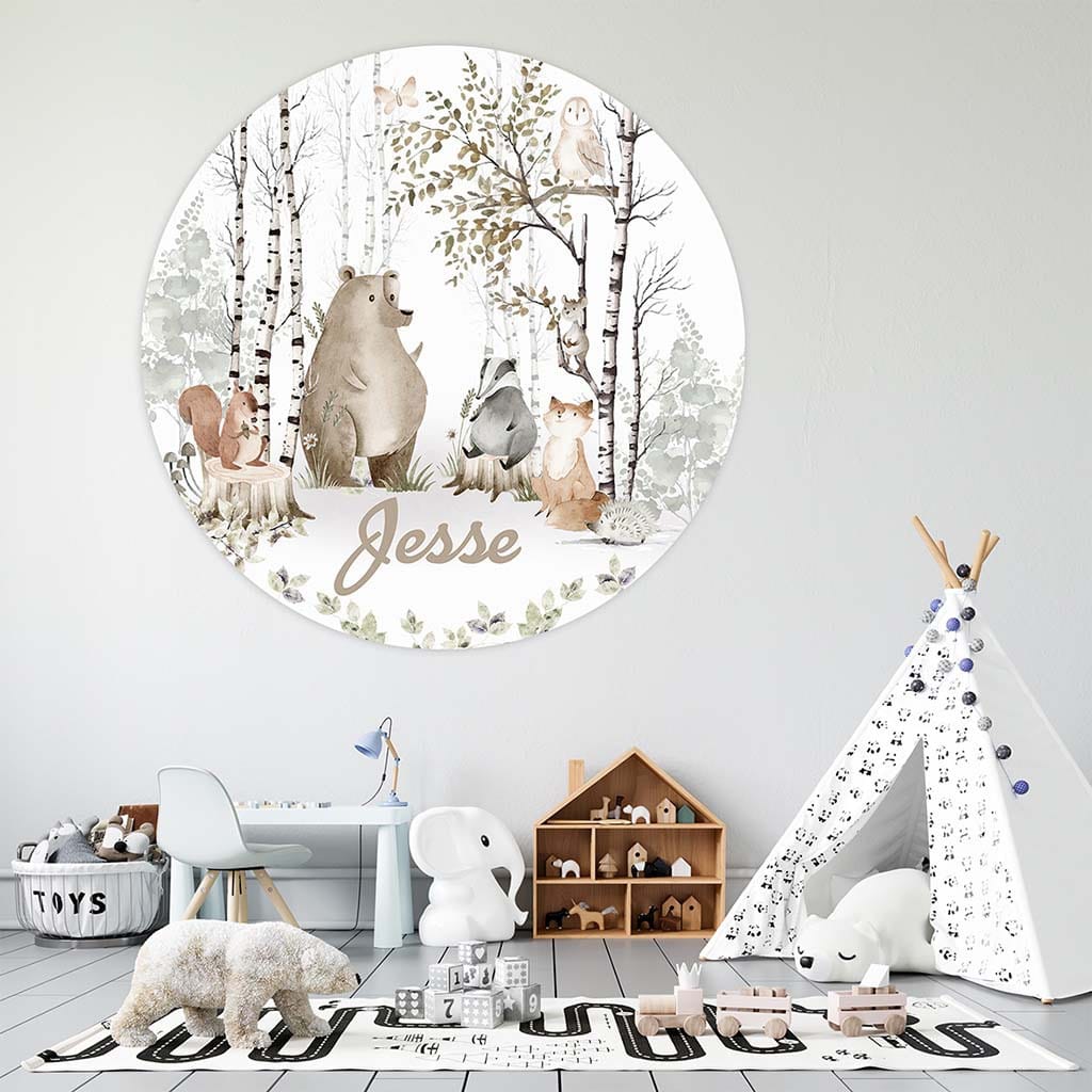 Gepersonaliseerde muurcirkel met dieren in het bos voor de kinderkamer of babykamer