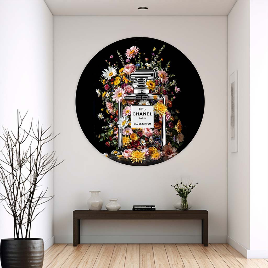 De muurcirkel Floral No.5 is onderdeel van de collectie muurcirkel Bloemen.  De muurcirkel Floral No.5 is onderdeel van de collectie muurcirkel Bloemen. Geef je interieur een vleugje luxe met Floral No. 5, een betoverende muurcirkel met bloemen waarin mode en natuur samenkomen. Dit stijlvolle Coco Chanel schilderij straalt elegantie uit met een explosie van kleurrijke bloemen rond een iconische parfumfles. Het perfecte Coco schilderij voor liefhebbers van tijdloze klasse en verfijnde kunst. Of je nu een passie hebt voor Chanel bloemen of op zoek bent naar een uniek No. 5 schilderij, deze wanddecoratie voegt een chique uitstraling toe aan elke ruimte. Laat je inspireren door de combinatie van bloem Chanel en haute couture in dit adembenemende Coco Chanel wandcirkel.