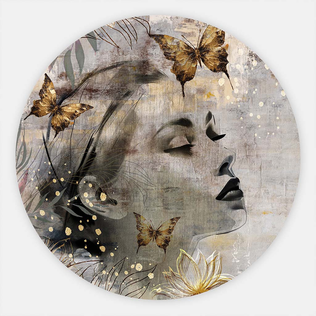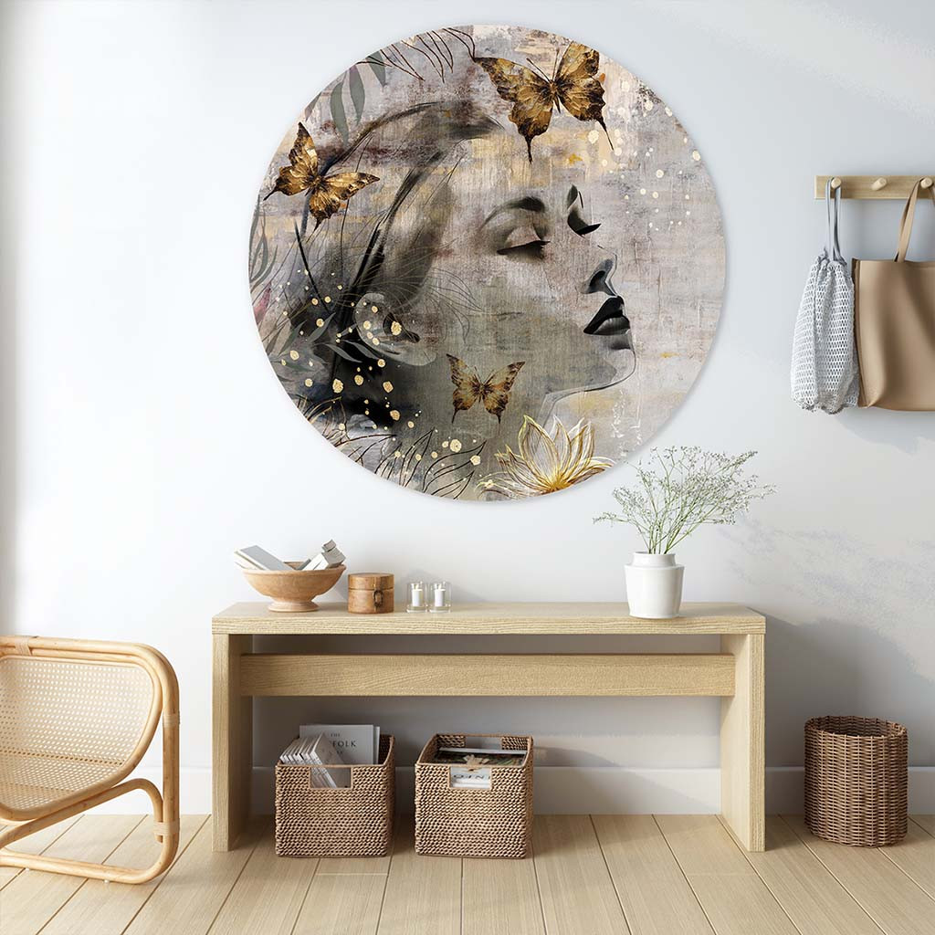 “Gilded Grace” is komt goed tot zijn recht op het luxe Aluminium Dibond, wat de zachte kleuren en gouden details extra benadrukt. Dit kunstwerk is perfect voor interieurliefhebbers die op zoek zijn naar een stijlvolle “muurcirkel vrouw” of een “muurcirkel vrouw met vlinders.” Of je nu een moderne woonkamer, slaapkamer of kantoor wilt decoreren, deze muurcirkel straalt tijdloze elegantie uit en voegt een uniek vleugje natuur en verfijning toe aan elke muur. Een ideale keuze voor een eigentijds en chic interieur!