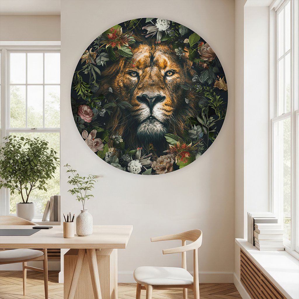 De muurcirkel Leeuw met bloemen is onderdeel van de collectie muurcirkel dieren. Verrijk je interieur met de betoverende kracht van deze Leeuw met bloemen muurcirkel — een kunstwerk waarin stoer dierenportret en zachte botanische elementen prachtig samenkomen. De intense blik van de leeuw, omringd door sierlijke bloemen en bladeren, maakt dit rond schilderij tot een echte eyecatcher in iedere ruimte. Deze muurcirkel past perfect binnen moderne, botanische en luxe woonstijlen en is ideaal als muurcirkel leeuw, schilderij leeuw, bloemen en dieren wanddecoratie of stijlvolle rond wandpaneel leeuw. Dankzij de ronde vorm krijgt het kunstwerk een zachte, elegante uitstraling die elke muur direct meer diepte en sfeer geeft. Of je dit kunstwerk gebruikt als krachtige blikvanger boven de bank, als sfeermaker in de slaapkamer, of als stijlvolle decoratie in een kantoor of entree — de Leeuw met bloemen muurcirkel brengt altijd karakter, rust en verfijning aan je interieur.