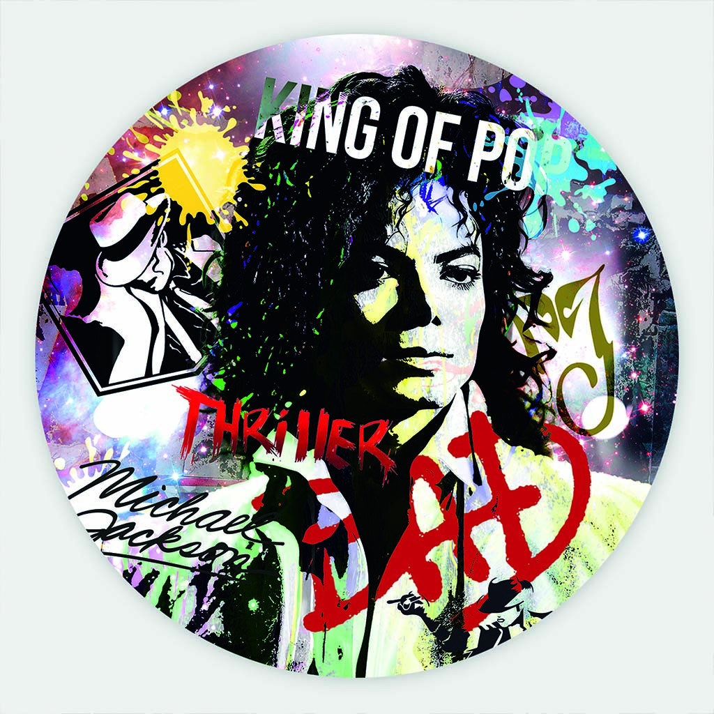 Dit unieke popart kunstwerk van Michael Jackson, verwerkt in een muurcirkel of wandcirkel, combineert de legendarische uitstraling van de King of Pop met een moderne, kleurrijke stijl. Het werk is een eerbetoon aan enkele van zijn meest iconische albums zoals ‘Thriller’, ‘Bad’ en ‘Dangerous’, met gedurfde typografie en levendige kleuren die perfect passen bij Jackson’s unieke persoonlijkheid en artistieke nalatenschap.
