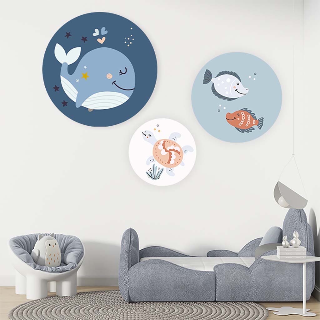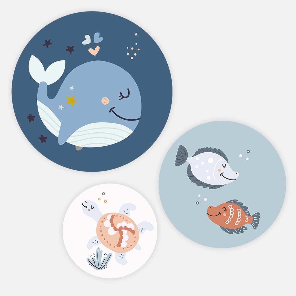 Muucirkel set van 3 Oceaan (Walvis, Zeeschildpad, Visjes) kinderkamer / babykamer Deze muurcirkel set van 3 is speciaal ontworpen voor de kinderkamer. De set bestaat uit een walvis, een zeeschildpad en twee visjes. Het combineren van meerdere wandcirkels is erg populair. Het creëert eenheid en rust, maar toch is het een speelse manier om de babykamer op te vrolijken. De muurcirkel set bestaat uit 3 muurcirkels. Je kunt kiezen uit de set Klein (formaten: Ø30 cm, Ø40 cm en Ø50 cm), de set Medium (formaten, Ø40 cm, Ø50 cm en Ø60 cm) of de set Groot formaten, Ø50 cm, Ø60 cm en Ø70 cm). De set wordt geleverd inclusief 3 ophangplaatjes.