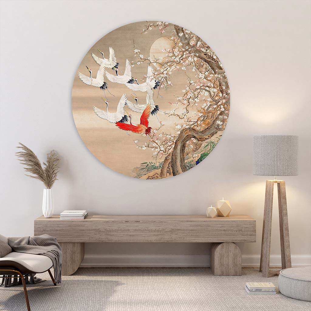 Breng een unieke mix van klassieke Japanse kunst en moderne elegantie in huis met deze exclusieve muurcirkel, geïnspireerd door twee iconische meesterwerken: Pruimenbloesem van So Shizan en het prachtige Vrouwen haori met witte en rode kraanvogels. Dit kunstwerk combineert de delicate bloesems van de Japanse pruimenboom met sierlijke kraanvogels, een symbool van geluk en voorspoed in de Japanse cultuur. De rode kraanvogel voegt een opvallend kleuraccent toe dat dit kunstwerk tot een echte eyecatcher maakt.