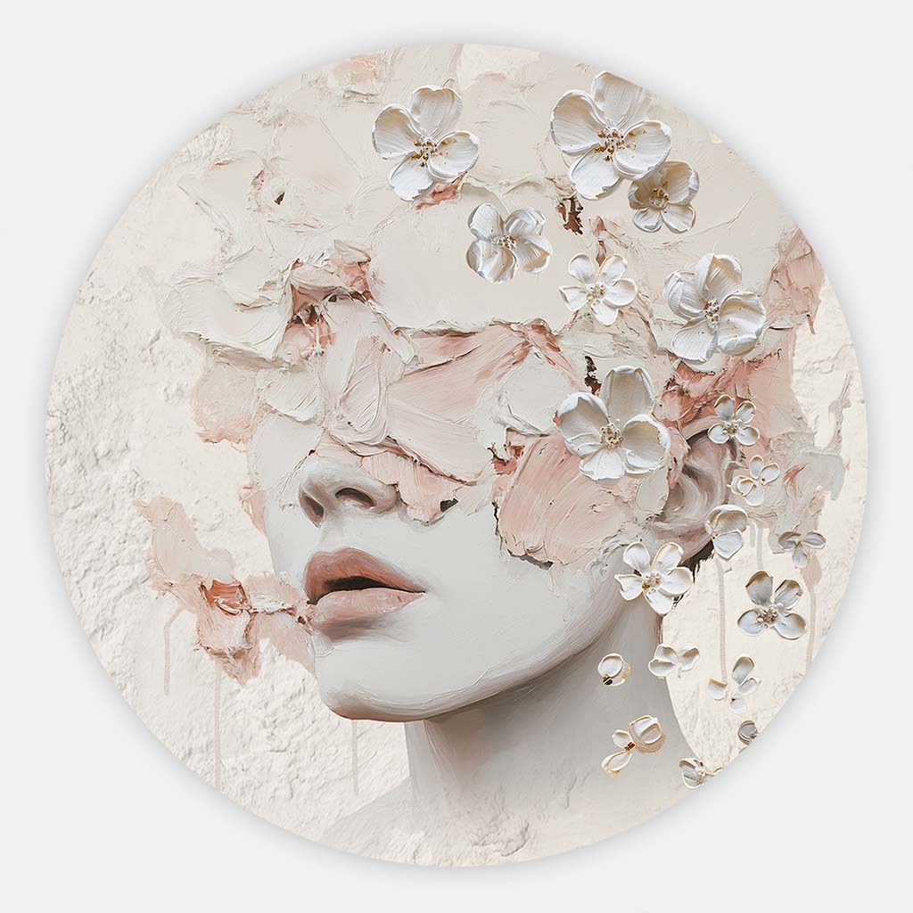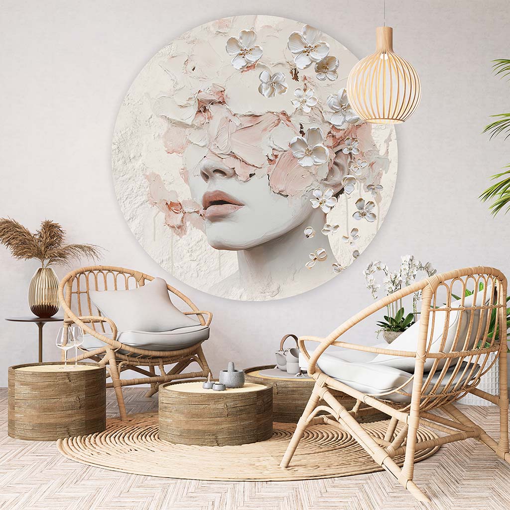 De muurcirkel Silent blossom is onderdeel van de collectie rond schilderij vrouw. Ontdek de tijdloze schoonheid van deze bijzondere muurcirkel vrouw, een kunstwerk dat elegantie en modern design naadloos combineert. Het ronde ontwerp geeft het de uitstraling van een uniek rond schilderij vrouw, waardoor het een echte blikvanger is in elke ruimte. Het subtiel uitgewerkte schilderij vrouw gezicht straalt rust en verfijning uit, terwijl de toevoeging van bloemen dit kunstwerk transformeert tot een delicate muurcirkel vrouw met bloemen. Door de ronde vorm en de zachte kleuren past dit schilderij vrouw perfect in uiteenlopende interieurs – van minimalistisch en modern tot warm en sfeervol. Deze muurcirkel is meer dan een decoratie; het is een stijlvol en artistiek statement dat elke muur tot leven brengt.