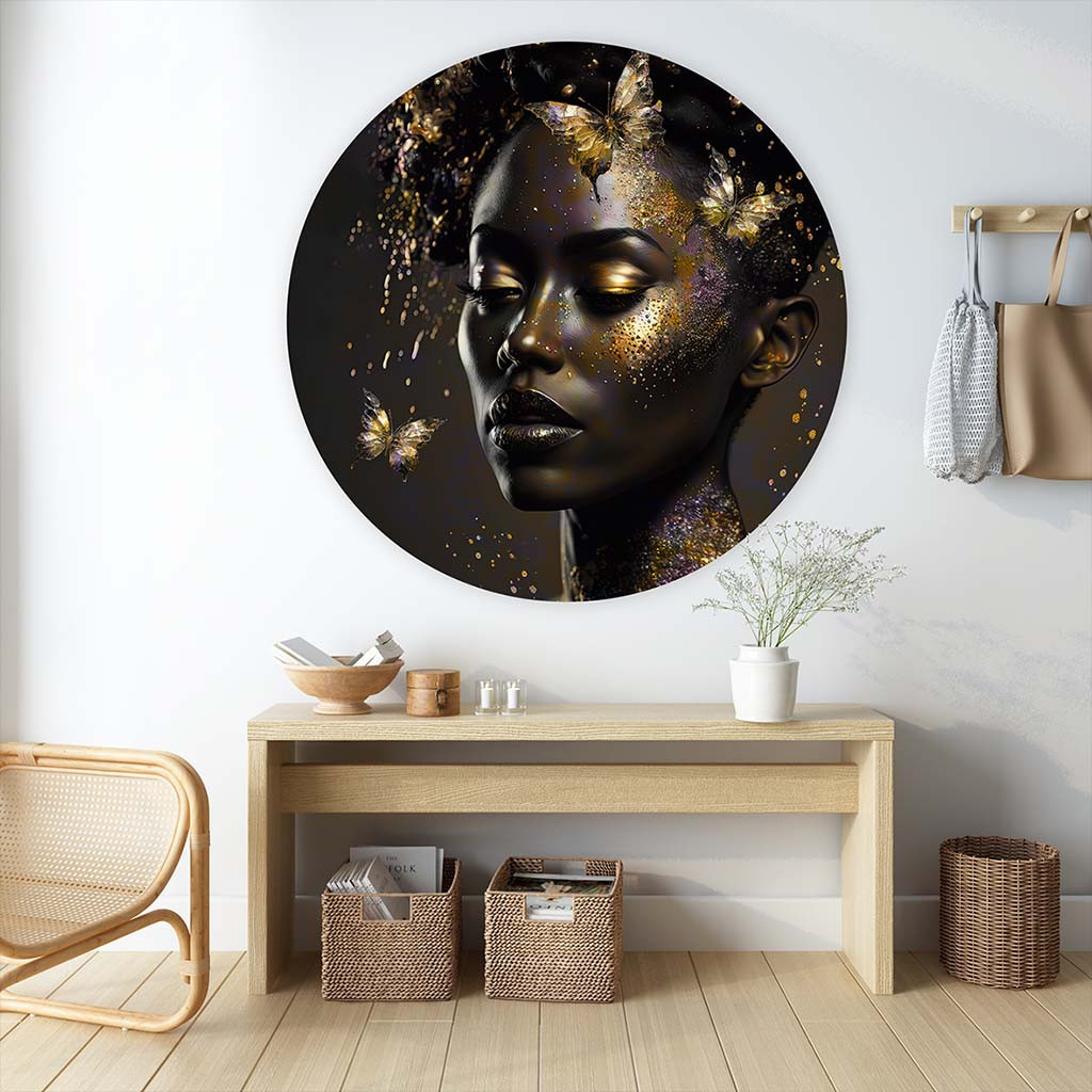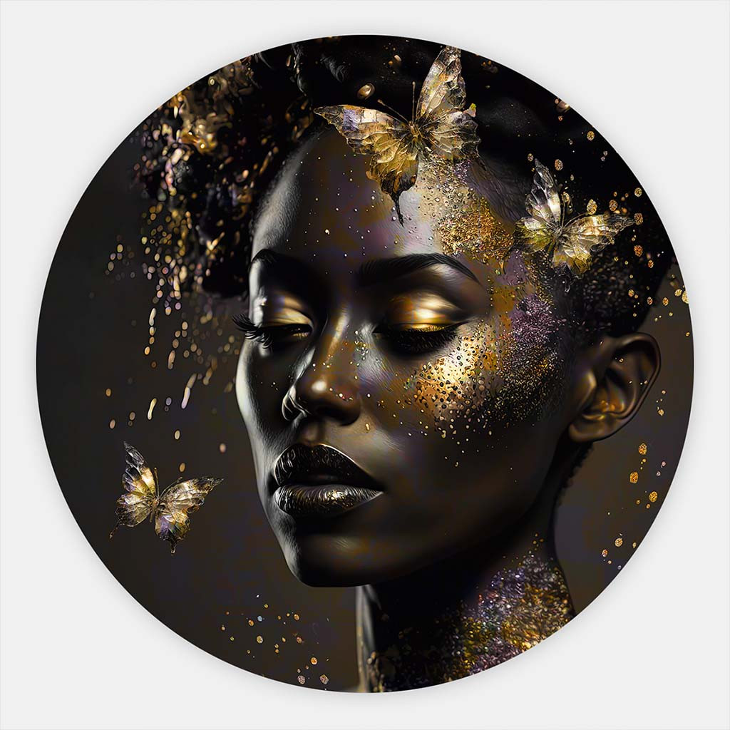 Als muurcirkel vrouw biedt dit kunstwerk een unieke, zachte vorm die perfect past in diverse ruimtes, zoals een woonkamer, slaapkamer of kantoor. Het combineert moderne luxe met abstracte schoonheid, waardoor het ideaal is voor liefhebbers van muurcirkel kunst of een rond schilderij vrouw gezicht. Het goud zorgt voor een warme, glamoureuze touch, terwijl de vlinders beweging en lichtheid toevoegen.