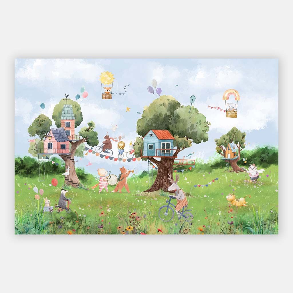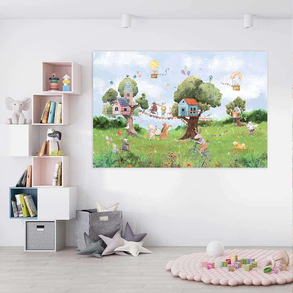Leuk schilderij met een aantal boomhutten en dieren in een groene weide. De dieren bouwen een feestje rondom de boomhut. Dit schilderij is speciaal ontworpen voor de kinderkamer en babykamer. Schilderijen met afbeeldingen van dieren zijn erg geliefd in de kinderkamer en babykamer.