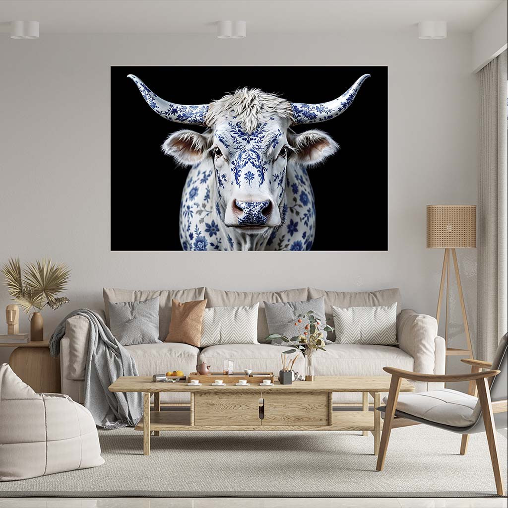 Het schilderij Delfts blauw koe is onderdeel van onze collectie schilderij Dieren. Dit schilderij van een koe in Delfts blauw stijl is een unieke combinatie van Nederlandse traditie en moderne kunst. De koeienkop schilderij straalt elegantie uit en is een perfect koeien schilderij voor een stijlvol interieur. Het subtiele maar krachtige ontwerp maakt deze koe delfts blauw tot een echte blikvanger.