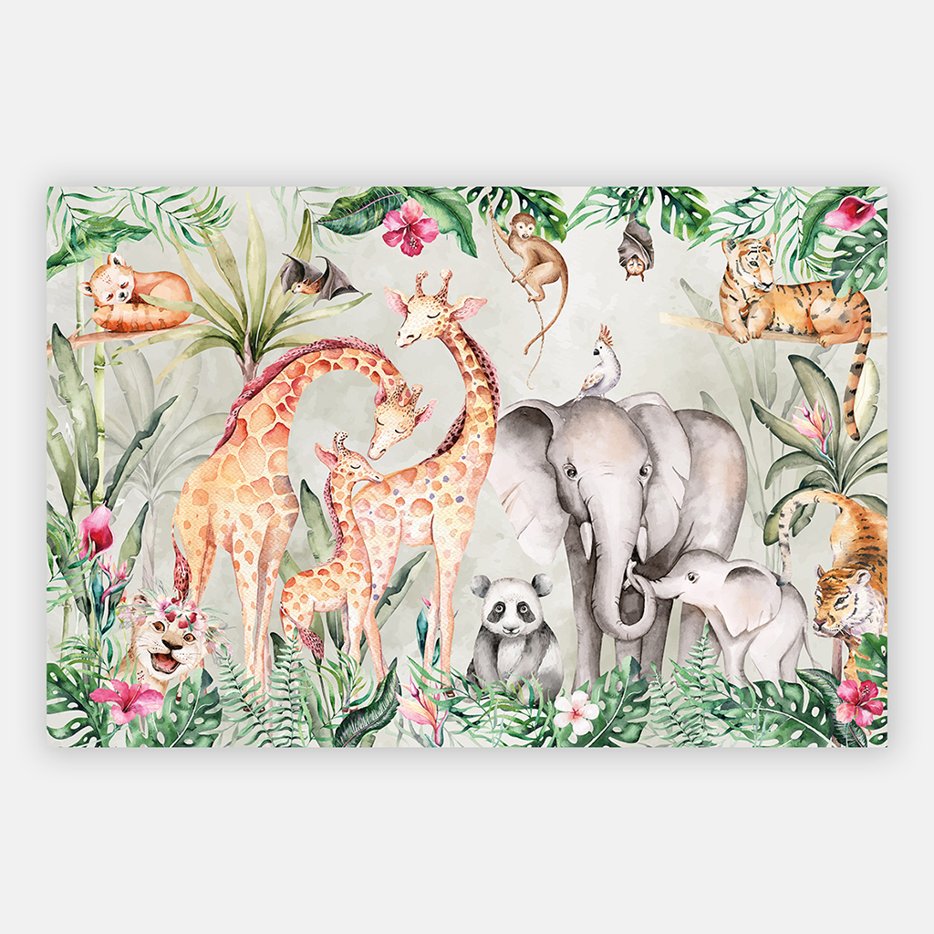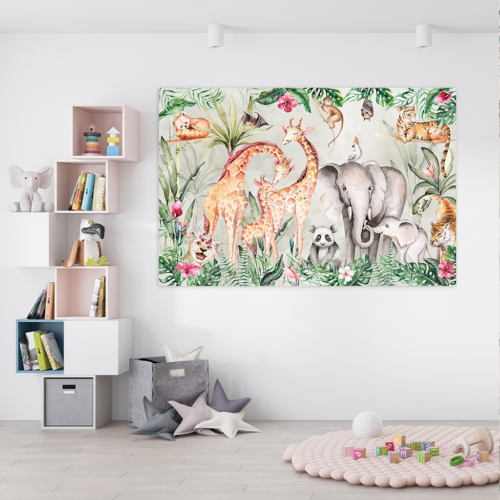 Het schilderij Happy jungle is onderdeel van de collectie schilderij kinderkamer. Ontdek de magie van de natuur met dit prachtige jungle schilderij – een sfeervol en liefdevol ontwerp dat perfect past in de kinderkamer of babykamer. Tussen het tropische groen komen speelse dieren tot leven: olifanten, giraffen, apen, tijgers en een panda vormen samen een vrolijke en rustgevende compositie. Dit schilderij jungle dieren brengt een warme, harmonieuze uitstraling in huis en nodigt uit tot fantasie en ontdekking. Ideaal als schilderij jungle voor een babykamer met een dierenthema, of als vrolijke wanddecoratie kinderkamer jungle dieren. De zachte kleuren en charmante illustraties maken dit schilderij kinderkamer tot een tijdloos kunstwerk dat meegroeit met je kind – van baby tot kleine avonturier.