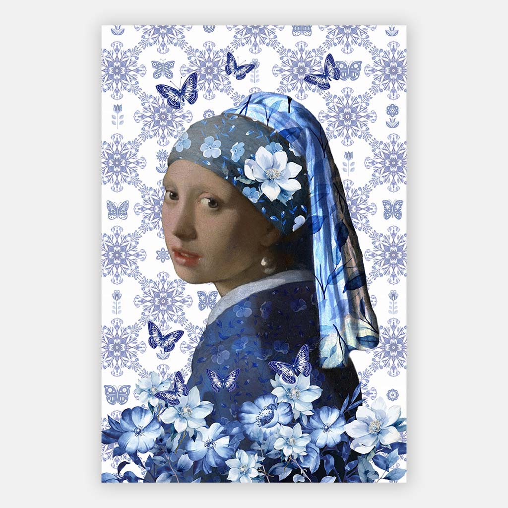 Het schilderij Meisje met de parel in Delfts blauw is onderdeel van de collectie oude meesters met een knipoog. In deze collectie zijn beroemde schilderijen van oude meesters in een modern jasje gestoken, ook bekend als, oude meesters met een twist.