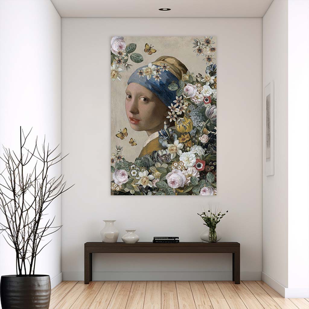 Het schilderij Meisje met de parel tussen bloemen is onderdeel van de collectie oude meesters met een knipoog. Breng de schoonheid van de klassieke schilderkunst naar je interieur met dit indrukwekkende Meisje met de Parel schilderij. Het wereldberoemde portret van Johannes Vermeer, beter bekend als het Meisje met de Parel, is hier omgeven door een weelderige compositie van bloemen en vlinders. Deze combinatie zorgt voor een levendige en frisse uitstraling, waardoor het kunstwerk een eigentijdse draai krijgt. Dit schilderij is een schitterend voorbeeld van oude meesters met een knipoog: een klassiek werk dat opnieuw is uitgevonden voor de moderne tijd. Door de bloemrijke toevoeging straalt het ook de charme uit van oude meesters bloemen, waarmee het zowel romantisch als stijlvol oogt. Het resultaat is een unieke Meisje met de Parel modern interpretatie die naadloos aansluit bij een hedendaagse inrichting. De combinatie van traditie en creativiteit maakt dit kunstwerk een prachtig voorbeeld van oude meesters in modern jasje. Vaak aangeduid als Meisje met de Parel bloemen, geeft het schilderij een frisse en inspirerende twist aan de klassieke schoonheid van het originele Vermeer Meisje met de Parel. Of je nu fan bent van kunstgeschiedenis of gewoon een opvallend kunstwerk zoekt voor je interieur, dit schilderij brengt sfeer, elegantie en een vleugje tijdloze schoonheid in huis.