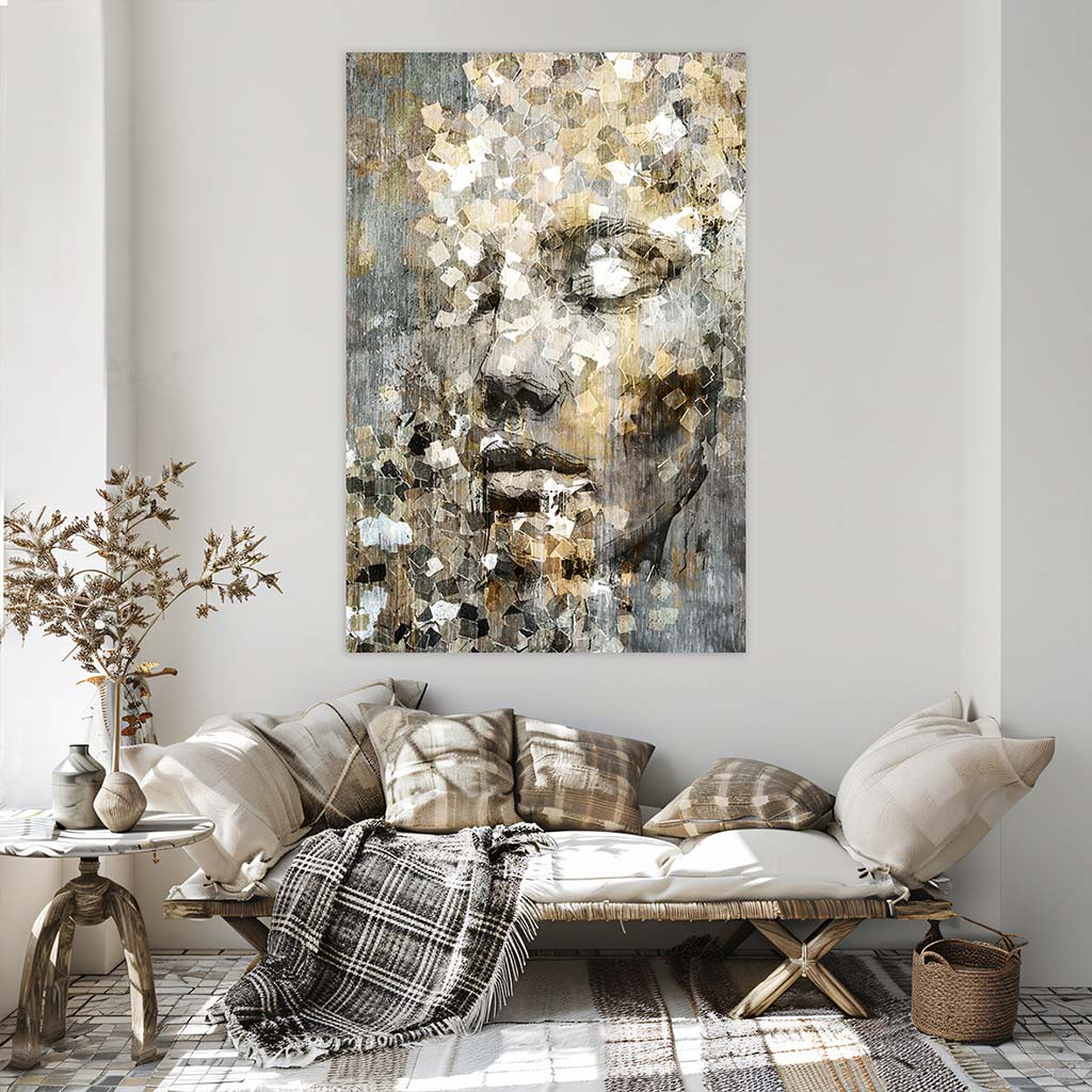 Dit unieke schilderij van een vrouwengezicht is een ware blikvanger en perfect voor elk modern interieur. Het kunstwerk speelt met abstracte vormen en zachte goudtinten, waardoor de delicate contouren van een vrouw zichtbaar worden te midden van een mozaïek van licht en schaduw. Dit verticale rechthoekige schilderij, biedt veelzijdige wanddecoratie-opties die direct sfeer toevoegen aan elke ruimte.