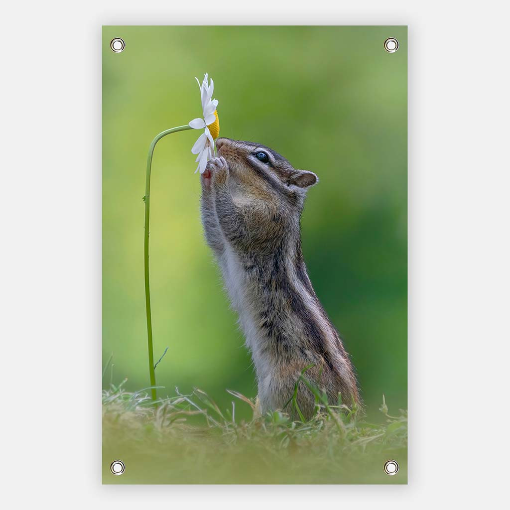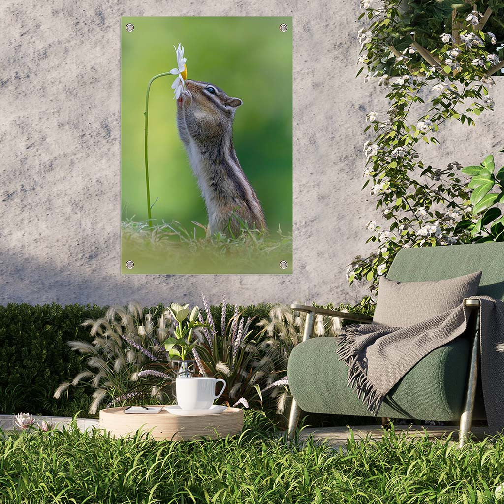 Heb jij een saaie muur of schutting in je tuin? Geef nu sfeer aan jouw tuin, balkon of dakterras met een met deze unieke Tuinposter Grondeekhoorn met bloem. Een tuindoek worden geleverd met één ring in elke hoek zodat je ze makkelijk kunt ophangen.