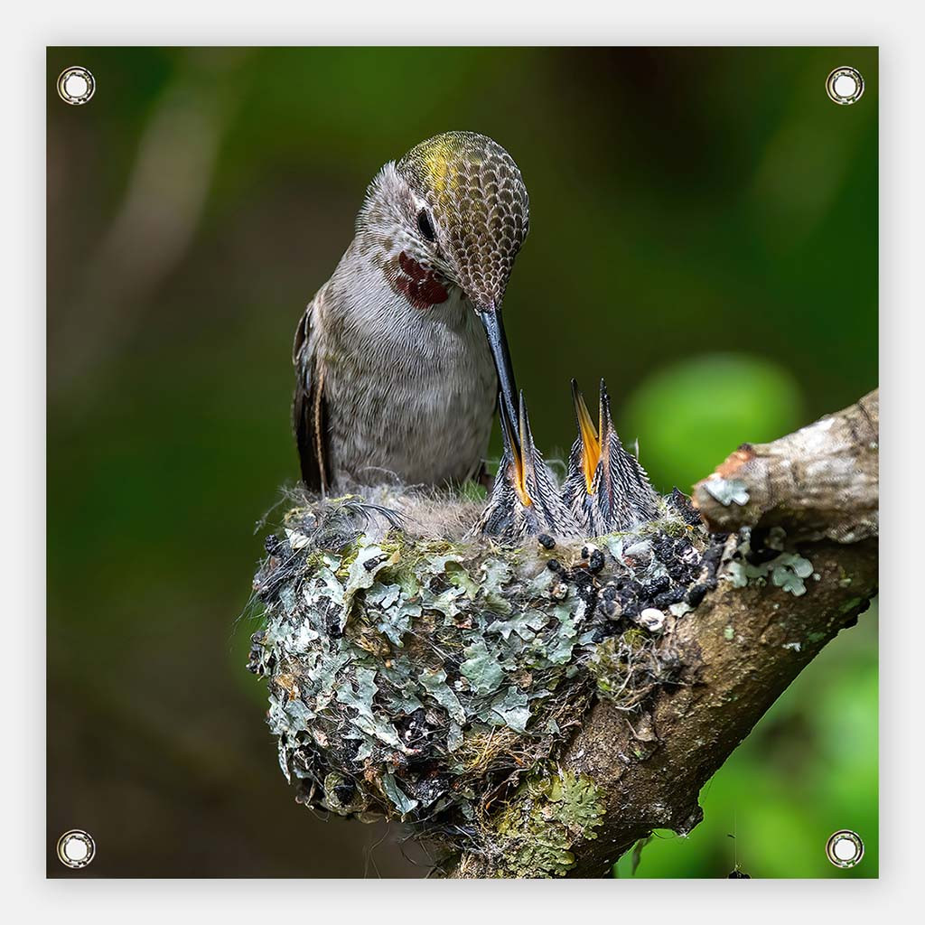 Heb jij een saaie muur of schutting in je tuin? Geef nu sfeer aan jouw tuin, balkon of dakterras met een met deze unieke Tuinposter Kolibri voert kleintjes. Een tuindoek worden geleverd met één ring in elke hoek zodat je ze makkelijk kunt ophangen.
