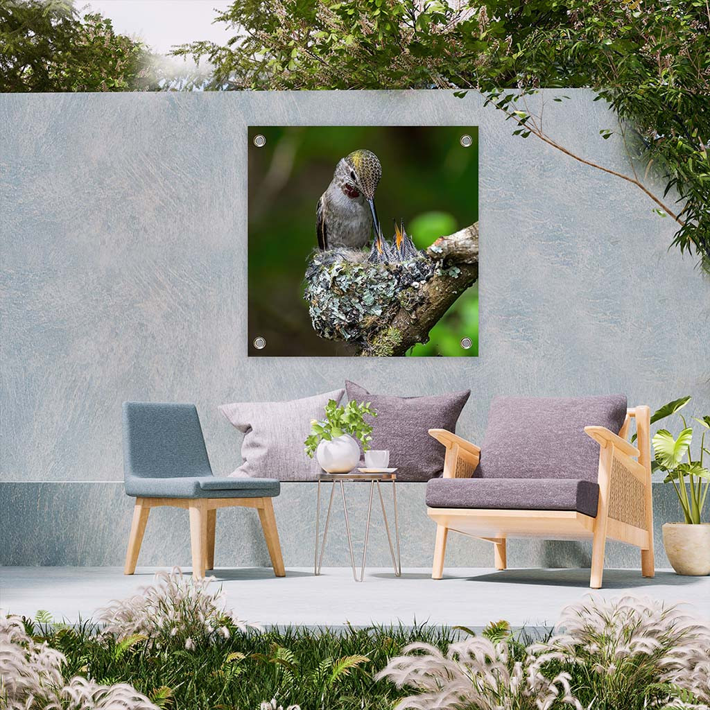 Heb jij een saaie muur of schutting in je tuin? Geef nu sfeer aan jouw tuin, balkon of dakterras met een met deze unieke Tuinposter Kolibri voert kleintjes.