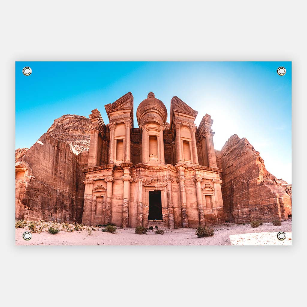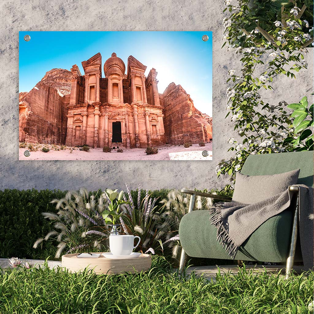 Heb jij een saaie muur of schutting in je tuin? Geef nu sfeer aan jouw tuin, balkon of dakterras met een met deze unieke Tuinposter Petra Jordanië. Een tuindoek worden geleverd met één ring in elke hoek zodat je ze makkelijk kunt ophangen.