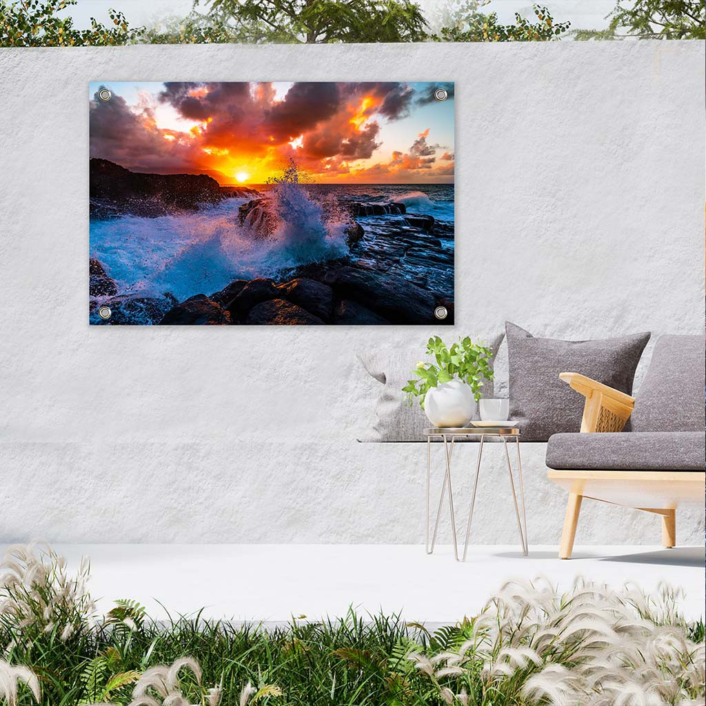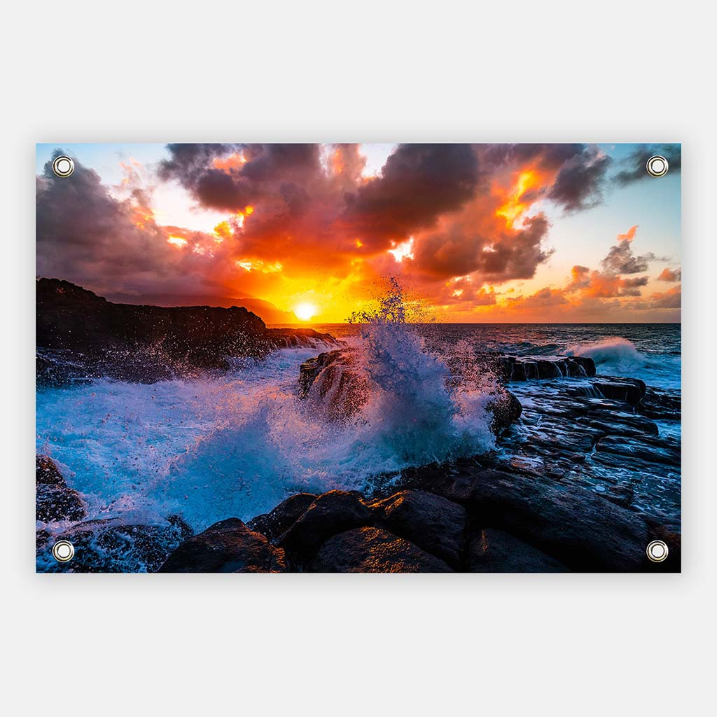 Heb jij een saaie muur of schutting in je tuin? Geef nu sfeer aan jouw tuin, balkon of dakterras met een met deze unieke Tuinposter rots formatie bij zee Queens Bath Kauai Hawaii zonsondergang. Een tuindoek worden geleverd met één ring in elke hoek zodat je ze makkelijk kunt ophangen.