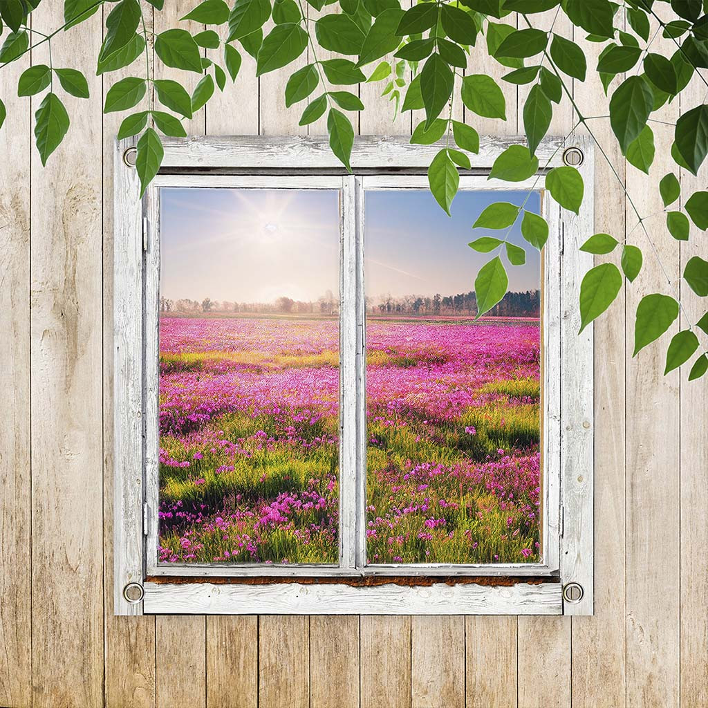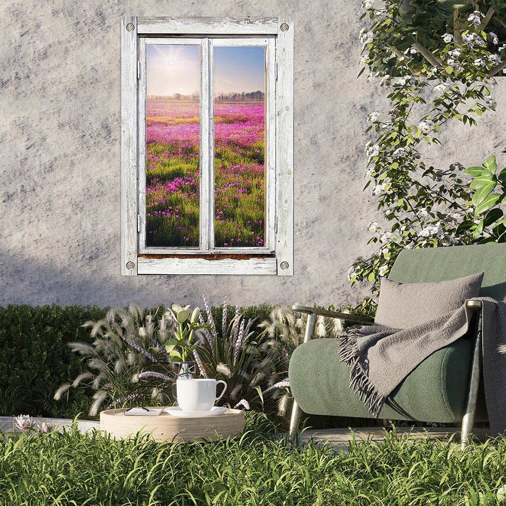 Is het niet fantastisch om vanuit je eigen tuin of balkon uitzicht te hebben op een weids veld vol met paars roze bloemen. Een oud raam biedt een verrassende doorkijk op een prachtig stukje natuur met velden vol met paars roze bloemen. Zo heb je uitzicht vanuit je eigen tuin op een mooi stuk natuur. Laat je tuin tot leven komen met deze charmante tuinposter.