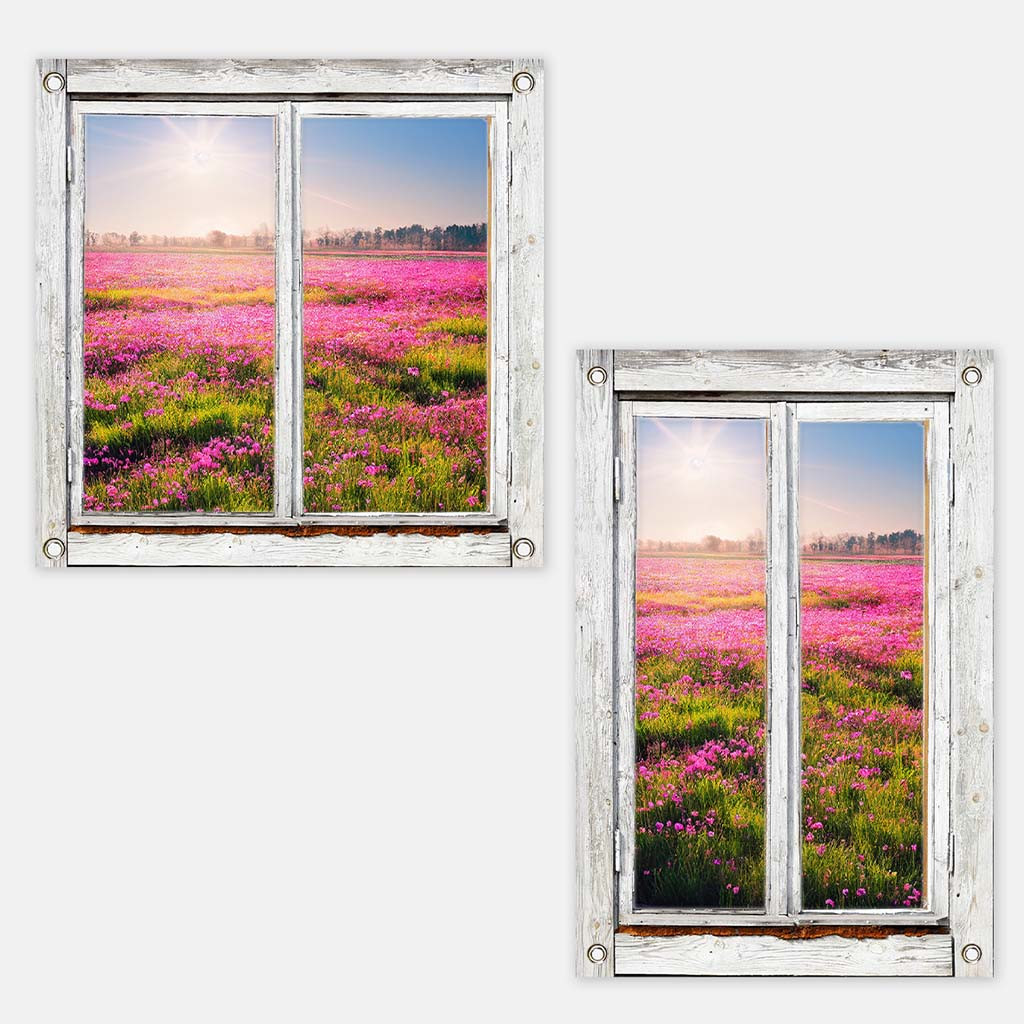 Is het niet fantastisch om vanuit je eigen tuin of balkon uitzicht te hebben op een weids veld vol met paars roze bloemen. Een oud raam biedt een verrassende doorkijk op een prachtig stukje natuur met velden vol met paars roze bloemen. Zo heb je uitzicht vanuit je eigen tuin op een mooi stuk natuur. Laat je tuin tot leven komen met deze charmante tuinposter. Een tuinposter met doorkijk raam kun je overal in je buitenruimte gebruiken. Zeer geschikt als decoratie op je tuin schutting, maar ook erg leuk om onder je overkapping te hangen of een overdekte buitenruimte.