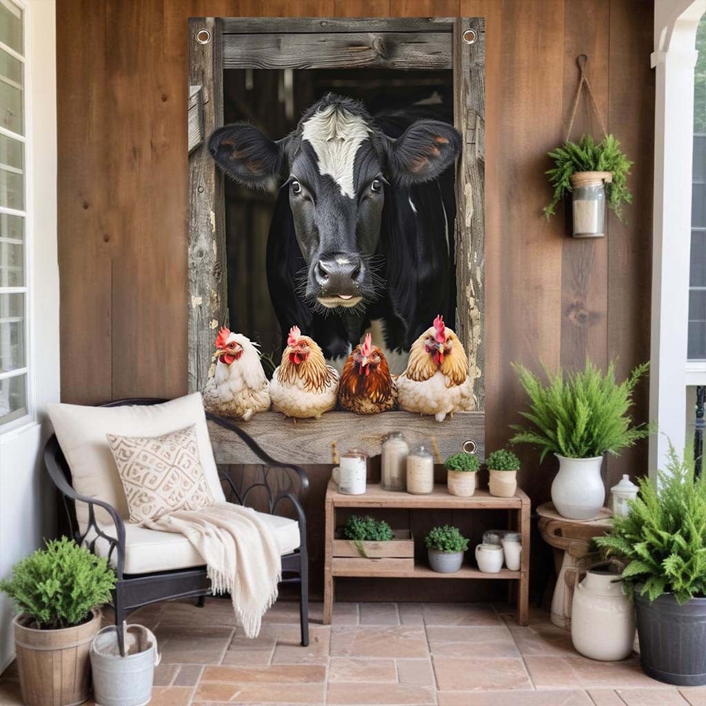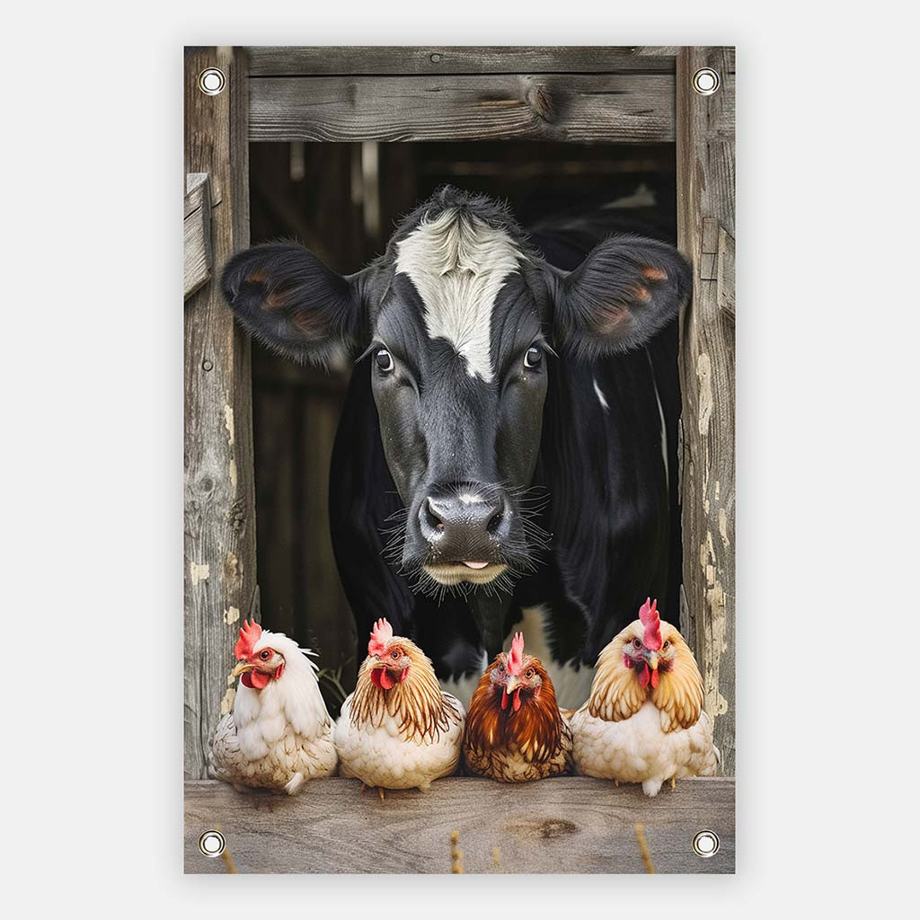 Creëer een landelijke Sfeer in je tuin. Deze tuinposter toont een charmante scène van een nieuwsgierige koe die door een houten schuur kijkt, omringd door vier kleurrijke kippen. Deze afbeelding vangt de essentie van het plattelandsleven en brengt een gevoel van rust en eenvoud naar je tuin. Ideaal voor zowel stadstuinen als landelijke buitenruimtes, deze tuinposter zorgt voor een warme en gezellige sfeer.