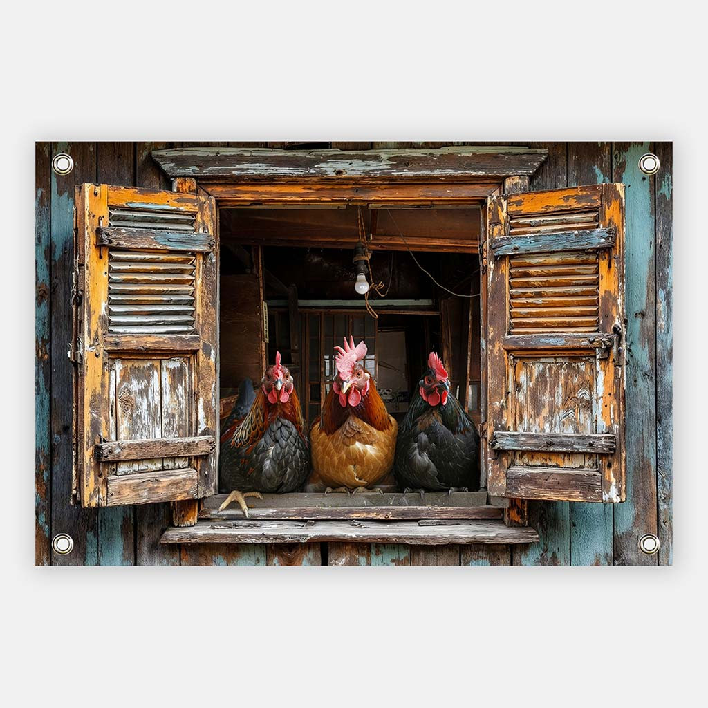 Breng het boerenleven in je tuin met deze tuinposter kippen / hanen. Dit sfeervolle tuinschilderij kippen toont drie kleurrijke hanen in een rustiek raam. Perfect als weerbestendig tuindoek haan voor je schutting of balkon. Karaktervol, landelijk en duurzaam!