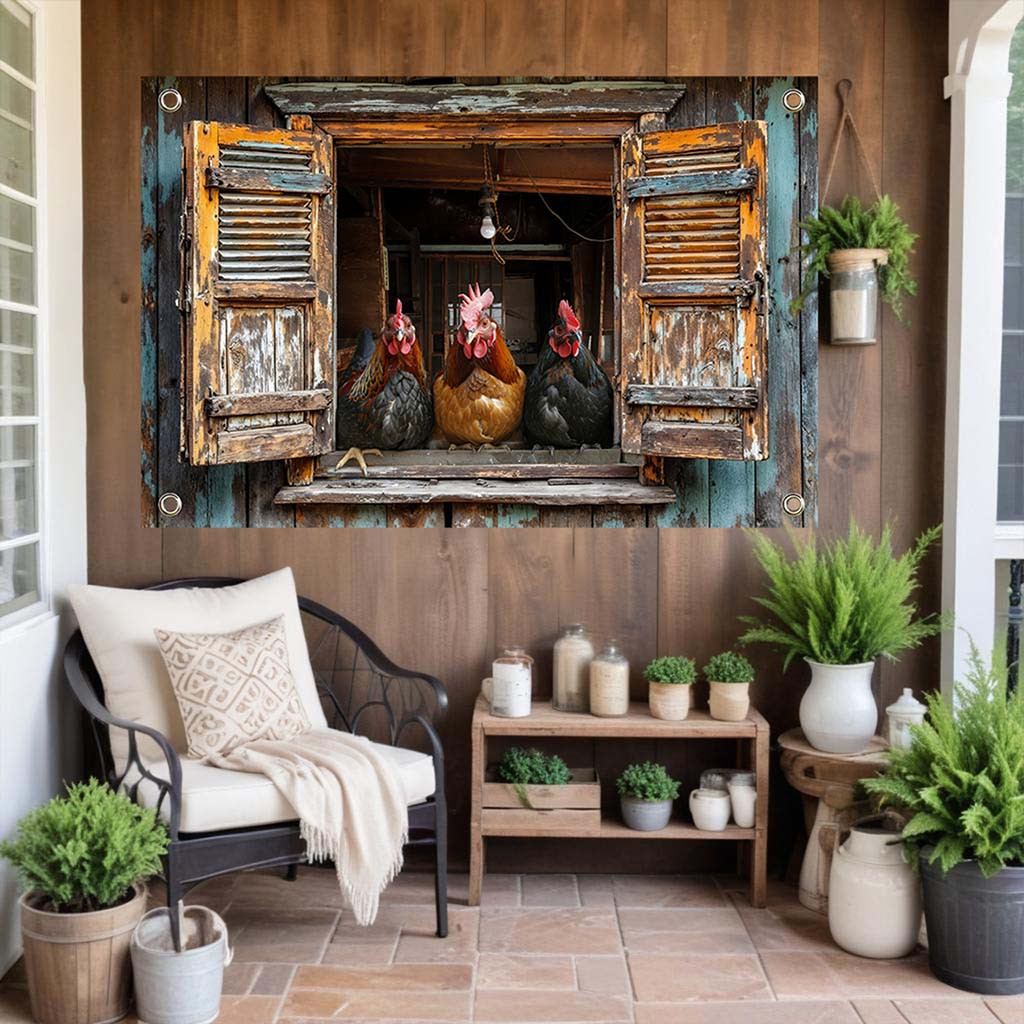 Met oog voor detail en een warme landelijke stijl is deze tuinposter kippen op boerderijraam niet alleen decoratief, maar ook duurzaam. Breng sfeer in je tuin met dit charmante boerenerf-tafereel!