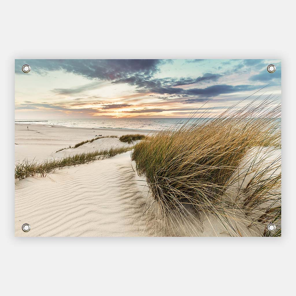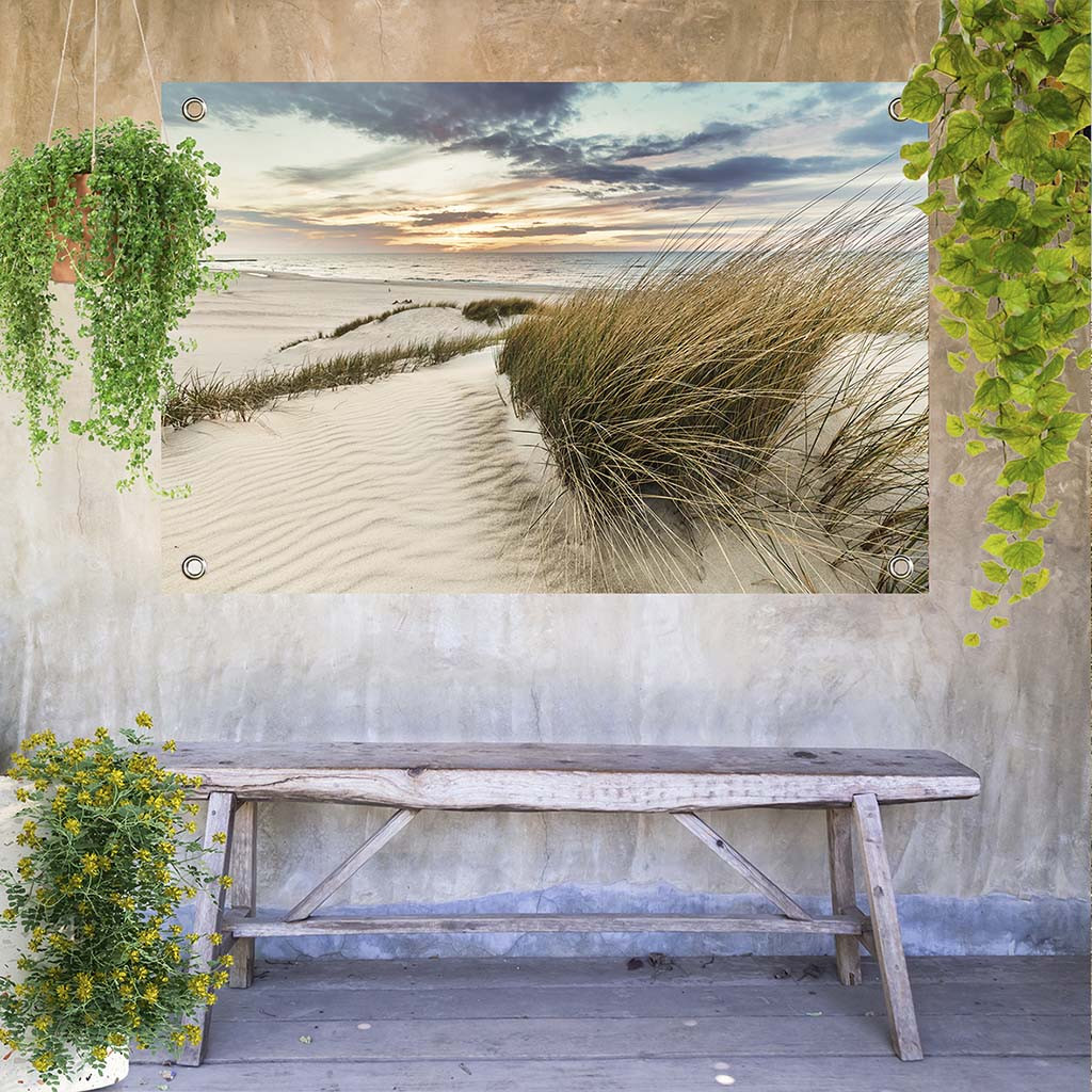Tuindoek met een uitzicht van strand en duinen. Breng de rust van het strand naar je eigen tuin met deze tuinposter van zandduinen, helmgras en de glinsterende zee. Een beeld dat ontspanning oproept, elke keer als je naar buiten kijkt. Breng dit strandlandschap naar jouw buitenruimte en geniet elke dag van dit prachtige uitzicht met een adembenemend mooie lucht van de zonsondergang.